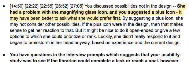 Second, ask another researcher, ideally someone more experienced than yourself, for feedback on your performance — specifically, time-stamped feedback. In this case, I sent the video of my session to my 18F colleague Victor Udoewa. I also shared with him the research plan for this study and the “interview prompts” I’d used to guide my moderation. Victor replied with the times where he thought I moderated well and times I might have done better (for example, when I suggested alternate UI designs after observing my participant struggle at completing a task).