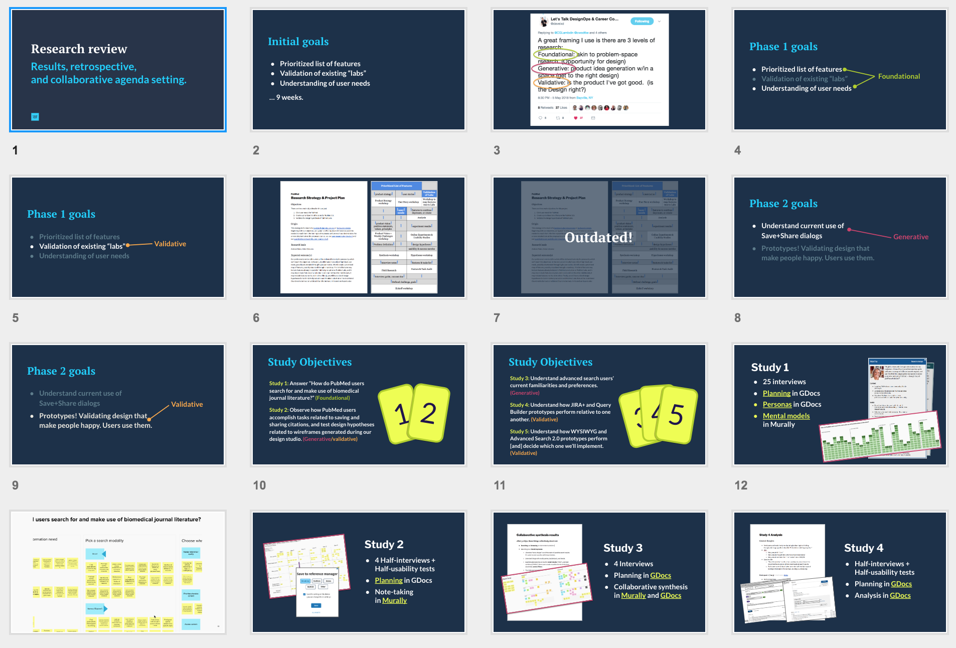 A research review proceeds in two parts. In the first, the product team reviews the design of and findings from recent studies (a natural prerequisite here is that you’ll need to have conducted a few studies beforehand). In the second, the team conducts a retrospective focused on research practices.