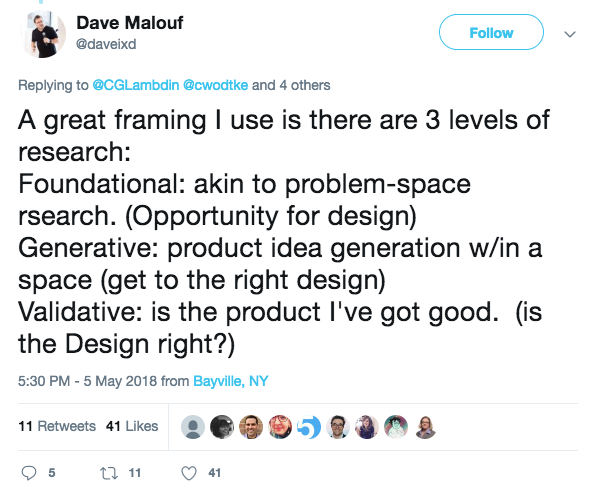 For that reason, I framed our review with a tweet by Dave Malouf describing research across various levels: