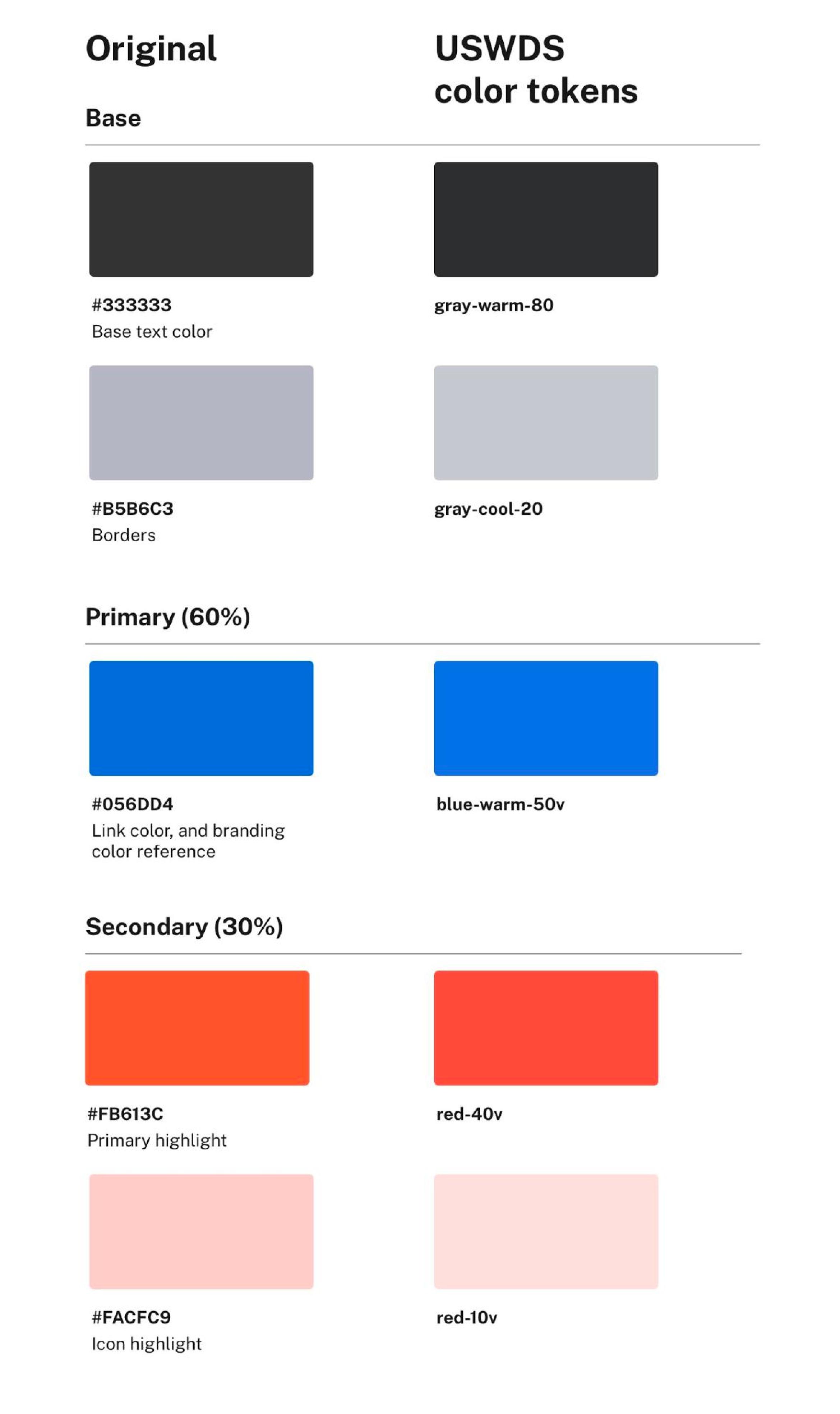 USWDS provides CSS classes that map to the color theme out of the box, which made it easy for us to prototype collaboratively on the fly. However, it did take us time to learn how theme variables were applied by default. There were undocumented assumptions about color usage that we had to learn as we worked. For example, it took some digging to see how theme variables map to USWDS components. And, when vivid tokens are called compared to more muted siblings. We also had to learn which theme colors were required and which were optional.